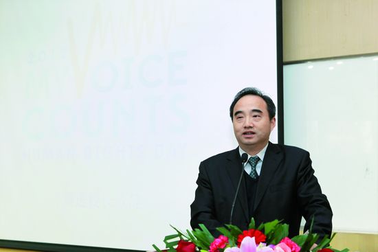 中國政法大學校長兼人權(quán)研究院院長黃進教授致開幕辭。他代表學校和人權(quán)研究院對出席本次活動的嘉賓表示誠摯的歡迎。他說,1948年12月10日,聯(lián)合國大會通過了《世界人權(quán)宣言》,向全世界莊嚴宣布“人人生而自由,在尊嚴和權(quán)利上一律平等”。如今,作為聯(lián)合國三大支柱的人權(quán),已經(jīng)在國際社會獲得普遍認可和接受。而中國人權(quán)經(jīng)過改革開放30多年的發(fā)展,也從悄然孕育在幽靜山谷中的蓓蕾,逐漸成為盛開在廣闊原野的花朵。他指出,中國政法大學人權(quán)研究院的成立和發(fā)展,是中國人權(quán)事業(yè)發(fā)展的一個縮影,它已成為開展人權(quán)學科建設(shè)、理論研究、人才培養(yǎng)、社會服務(wù)、學術(shù)交流與合作的重要平臺。他強調(diào),“經(jīng)國緯政,法澤天下;經(jīng)世濟民,福澤萬邦”是中國政法大學的辦學目標,“以人為本,尊重人權(quán)”是中國政法大學堅守的人文精神。黃進希望,通過此次活動,宣傳、紀念、推動人權(quán)事業(yè)的發(fā)展,把尊重和保護人權(quán)內(nèi)化為中國的信仰和生活方式,成為中國文化的重要部分,繼續(xù)攜手共進為人類人權(quán)事業(yè)的不斷發(fā)展做出我們應有的更大貢獻。