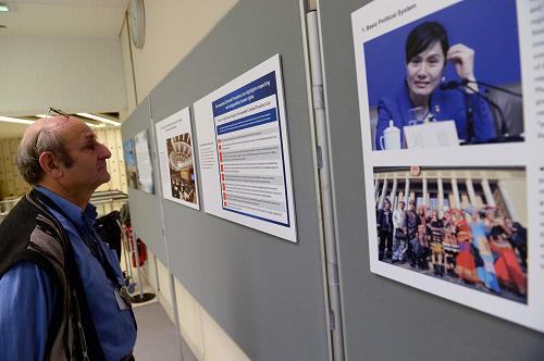 10月21日,在瑞士日內(nèi)瓦萬國宮,一名觀眾觀看《中國人權(quán)成就圖片展》。新華社記者 王思維 攝