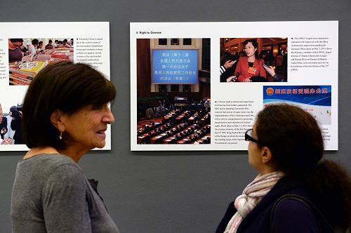 10月21日,在瑞士日內(nèi)瓦萬國宮,人們觀看《中國人權(quán)成就圖片展》。新華社記者 王思維 攝