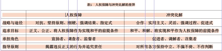 最后是方法選擇上的差異。人權(quán)保障要求只能采取人權(quán)保障所推崇的方式來解決問題,而這些方式往往不足以實(shí)現(xiàn)沖突化解的目標(biāo)。因此,沖突化解實(shí)際采取的手段經(jīng)常會(huì)遠(yuǎn)遠(yuǎn)超出人權(quán)保障所推崇方式的范圍,這導(dǎo)致人權(quán)保障工作者與沖突化解工作者對(duì)同一解決方式常常會(huì)給予不同的評(píng)價(jià)。因此,如何協(xié)調(diào)二者的工作,便是需要進(jìn)一步研究的問題。