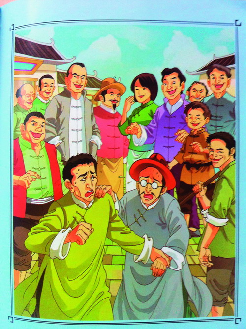 彩圖底下所配的文字是:“新聾子、新瞎子走到哪兒,哪兒就引起一陣紛擾。這些人對他們倆指指點點,臉上現(xiàn)出輕蔑的笑;嘴唇都在動,說的都是些嘲弄他們倆的話。周圍都是奚落的臉色。聾子拉著瞎子,瞎子推著聾子,他們倆一個推一個,跑得馬一樣快。”(14)