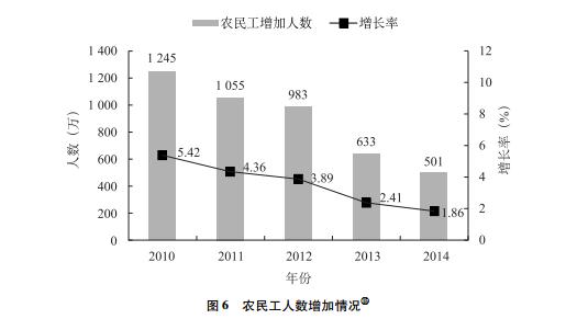 再次,從受影響的權(quán)利主體來看,經(jīng)濟(jì)增速放緩和經(jīng)濟(jì)發(fā)展方式轉(zhuǎn)變對不同社會人群的影響是不一樣的。對受過更好教育、掌握更好工作技能以及具有更多經(jīng)濟(jì)和社會資源的人群來說,經(jīng)濟(jì)增速放緩和經(jīng)濟(jì)發(fā)展方式轉(zhuǎn)變可能對他們的負(fù)面影響并不明顯,甚至有時會為他們提供更好的就業(yè)機(jī)會。而對那些受教育相對較少、工作技能相對簡單并且缺乏經(jīng)濟(jì)和社會資源的弱勢人群來說,其權(quán)利的實現(xiàn)將會因此面臨更嚴(yán)峻的挑戰(zhàn)。經(jīng)濟(jì)結(jié)構(gòu)調(diào)整會出現(xiàn)傳統(tǒng)型企業(yè)的裁員和倒閉,而首先被解雇的員工往往是那些受教育程度較低的人。技術(shù)變革和科技創(chuàng)新導(dǎo)致機(jī)器對人的替代,而首先被替代的也是那些受教育程度較低、技術(shù)水平不是很高的員工。“數(shù)據(jù)顯示,2015年2月,國內(nèi)工業(yè)增加值累計增長6.8%,固定資產(chǎn)投資完成額累計增長13.9%,房地產(chǎn)投資累計增長10.4%,上述有利于勞動力就業(yè)的多項經(jīng)濟(jì)指標(biāo)均為‘十一五’以來的最低水平。” ?根據(jù)人力資源和社會保障部的統(tǒng)計數(shù)據(jù)來看,2011-2014年,每年就業(yè)人數(shù)的增加數(shù)量基本保持平穩(wěn),大約在200-300萬之間;新增就業(yè)人數(shù)也保持相對穩(wěn)定增長,大約在1,168萬到1,322萬之間。但農(nóng)民工的增加人數(shù)卻從2010年以來逐年顯著下降(見圖6)。這從一個側(cè)面反映了經(jīng)濟(jì)新常態(tài)對農(nóng)民工這一弱勢群體就業(yè)的影響。