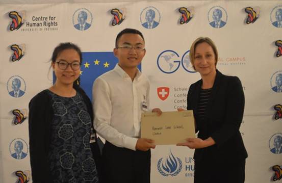 本次比賽由2014級(jí)人權(quán)法方向法律碩士黎夢(mèng)以及法學(xué)院本科生李卓臨兩名隊(duì)員組成,系法學(xué)院首次組隊(duì)參賽,陸海娜老師擔(dān)任教練。比賽期間,參賽隊(duì)員們展現(xiàn)出了扎實(shí)的法律基礎(chǔ)和突出的語(yǔ)言能力,在半決賽環(huán)節(jié)分別對(duì)陣來(lái)自肯尼亞、白俄羅斯、泰國(guó)和巴西的四支參賽隊(duì)伍,最終以答辯狀第3名的好成績(jī)順利收官。