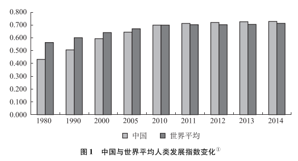 自20世紀(jì)70年代末推行改革開(kāi)放以來(lái),中國(guó)的人類(lèi)發(fā)展取得了巨大進(jìn)步(見(jiàn)圖1)。2014中國(guó)的人類(lèi)發(fā)展指數(shù)達(dá)到0.727,在188個(gè)國(guó)家(地區(qū))中列第90位,已進(jìn)入高人類(lèi)發(fā)展水平國(guó)家組。在1990年處于低人類(lèi)發(fā)展水平組別的47個(gè)國(guó)家中,到2014年中國(guó)是唯一躋身高人類(lèi)發(fā)展水平組的國(guó)家。