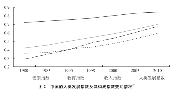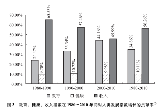 報(bào)告分析指出,快速的經(jīng)濟(jì)增長(zhǎng)對(duì)中國(guó)的人類(lèi)發(fā)展進(jìn)步起到了非常重要的作用(見(jiàn)圖2)。從1980到2010年的30年間,中國(guó)收入指數(shù)的增幅在全球排名第一,經(jīng)濟(jì)增長(zhǎng)對(duì)人類(lèi)發(fā)展指數(shù)增長(zhǎng)的貢獻(xiàn)達(dá)到56.26%,其中1980-1990年間的貢獻(xiàn)率更是高達(dá)65.53%。得益于經(jīng)濟(jì)的快速增長(zhǎng),約6.6億農(nóng)村貧困人口擺脫貧困,②物質(zhì)生活水平顯著改善,機(jī)會(huì)和選擇大幅擴(kuò)展。