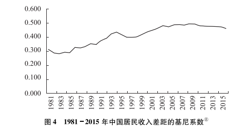 ⑧注:1981年至2001年數(shù)據(jù)源自世界銀行Martin Ravallion和Shaohua Chen 2004年根據(jù)國(guó)家統(tǒng)計(jì)局提供的住戶調(diào)查計(jì)算的數(shù)據(jù);2002年的數(shù)據(jù)采用Branko Milanovic整理的世界166個(gè)國(guó)家近60年的基尼系數(shù)數(shù)據(jù)庫(kù)ALG;2003年至2014年源自中國(guó)國(guó)家統(tǒng)計(jì)局歷年發(fā)布的基尼系數(shù)。