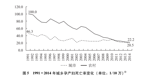 ?、赓Y料來(lái)源:《2015年中國(guó)統(tǒng)計(jì)年鑒》。注:2014年城市和農(nóng)村的孕產(chǎn)婦死亡率分別為20.5/10萬(wàn)和22.2/10萬(wàn)。
