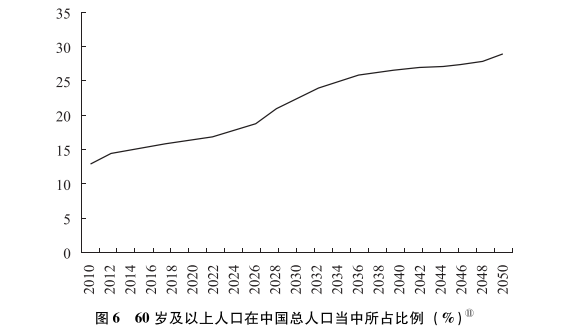 報(bào)告認(rèn)為,中國(guó)的人類(lèi)發(fā)展在包容性、共享性方面,雖然有一些進(jìn)展,但仍存在不少問(wèn)題。并且,在今后一個(gè)時(shí)期,中國(guó)還將面臨許多新的困難和挑戰(zhàn),如人口結(jié)構(gòu)變化以及老齡化(見(jiàn)圖6)、經(jīng)濟(jì)和財(cái)政增速趨緩、城鎮(zhèn)化和大規(guī)模人口流動(dòng)、公眾預(yù)期增長(zhǎng)、信息化和數(shù)字鴻溝,等等。針對(duì)當(dāng)前存在的問(wèn)題和未來(lái)的挑戰(zhàn),中國(guó)通過(guò)頂層設(shè)計(jì)與地方試點(diǎn)相結(jié)合,積極探索創(chuàng)新性的解決方案,在減貧、教育、健康、社會(huì)治理等領(lǐng)域,進(jìn)行了許多有益的、試驗(yàn)性的探索和創(chuàng)新。