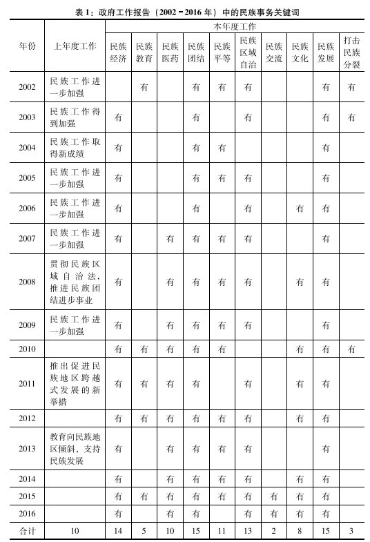 本文以國務(wù)院政府工作報(bào)告為切入視角,原因有三:其一,政府工作報(bào)告具有官方的權(quán)威性。少數(shù)民族人權(quán)作為一項(xiàng)人權(quán),其實(shí)現(xiàn)的義務(wù)主體涵蓋包括少數(shù)民族個(gè)人自身在內(nèi)的一切社會(huì)主體,但其中最主要的義務(wù)承擔(dān)者應(yīng)當(dāng)是國家(政府)。國務(wù)院政府工作報(bào)告是國務(wù)院對全國人民代表大會(huì)負(fù)責(zé)并報(bào)告工作的具體體現(xiàn),既是對前一年工作的回顧,又是對當(dāng)年工作的安排和部署,反映了政府在推進(jìn)人權(quán)事業(yè)方面的行動(dòng)綱領(lǐng)。而且,政府工作報(bào)告經(jīng)全國人大代表審議,全國政協(xié)委員提出意見,表決通過后具有法律效力。其二,政府工作報(bào)告具有年度的延續(xù)性。政府工作報(bào)告是一種年度連續(xù)性文件,每年從報(bào)告起草、征求意見到審議表決遵循相同的程序,因此,其記載的內(nèi)容具有縱向的歷史可比性,分析政府工作報(bào)告可以追蹤政府關(guān)注問題的變遷,進(jìn)而推斷出少數(shù)民族權(quán)利實(shí)現(xiàn)狀況的改變。其三,政府工作報(bào)告具有內(nèi)容的側(cè)重性。雖然政府工作報(bào)告涵蓋國民經(jīng)濟(jì)和社會(huì)發(fā)展的各方面內(nèi)容,力求全面客觀,但是作為中央政府工作部署的綱領(lǐng),不可能面面俱到,而是突出重點(diǎn)問題和重點(diǎn)工作,針對性強(qiáng),容易發(fā)現(xiàn)少數(shù)民族權(quán)利保障工作的重心。本文從歷年的《人民日報(bào)》以及人民出版社出版的單行本、輔導(dǎo)讀本或?qū)W習(xí)讀本中,收集了自2002年到2016年國務(wù)院總理在全國人民代表大會(huì)上所作的政府工作報(bào)告,并將報(bào)告涉及少數(shù)民族內(nèi)容的關(guān)鍵詞整理成表1。