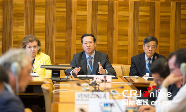 中國常駐日內(nèi)瓦大使馬朝旭(中)、中國人權(quán)研究會秘書長魯廣錦(右)、希臘常駐日內(nèi)瓦大使科卡(左)