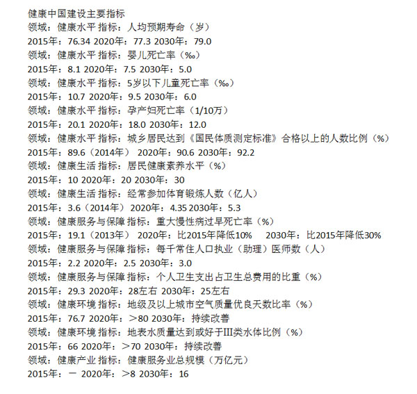 2012年以來,中國不斷加大醫(yī)藥衛(wèi)生體制改革力度,加快推進(jìn)公立醫(yī)院綜合改革,推進(jìn)藥品和醫(yī)療服務(wù)價格改革,全面實施城鄉(xiāng)居民大病保險,積極建設(shè)分級診療制度,優(yōu)化完善藥品生產(chǎn)流通使用政策。2015年10月29日,健康中國建設(shè)正式寫入黨的十八屆五中全會公報。2016年8月,全國衛(wèi)生與健康大會提出:“要堅持正確的衛(wèi)生與健康工作方針,以基層為重點,以改革創(chuàng)新為動力,預(yù)防為主,中西醫(yī)并重,將健康融入所有政策,人民共建共享。”2016年10月,國家頒布《“健康中國2030”規(guī)劃綱要》,為推進(jìn)健康中國建設(shè),提高人民健康水平做出了戰(zhàn)略部署。