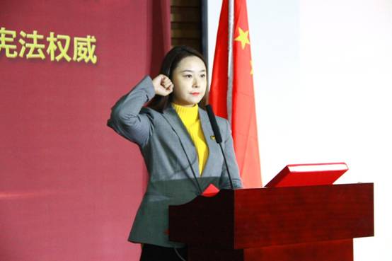 隨后,活動進入了憲法宣誓環(huán)節(jié),現(xiàn)場觀眾全體起立,奏唱國歌。中國人民大學法學院團委書記肖晶作為領誓人,在國旗和國徽下手扶憲法典,帶領全場完成了莊嚴的宣誓。