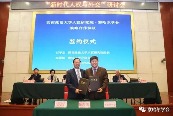 開(kāi)幕式上,察哈爾學(xué)會(huì)秘書(shū)長(zhǎng)、中國(guó)人權(quán)研究會(huì)常務(wù)理事、原駐斯特拉斯堡總領(lǐng)事張國(guó)斌與西南政法大學(xué)黨委副書(shū)記、校長(zhǎng)、人權(quán)研究院院長(zhǎng)付子堂在多方見(jiàn)證下,分別代表察哈爾學(xué)會(huì)和西政人權(quán)研究院就智庫(kù)發(fā)展建設(shè)領(lǐng)域進(jìn)行全面合作,建立戰(zhàn)略合作關(guān)系,簽署合作意向書(shū)。