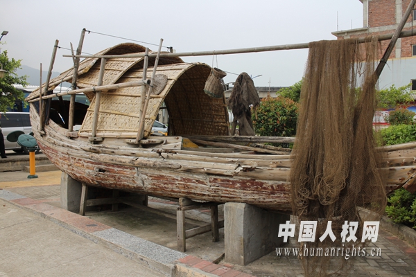擺在溪邳村村口的“連家船”展品。(中國人權(quán)網(wǎng)記者 石堅(jiān) 攝)
