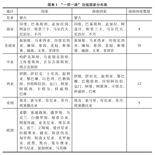 人權(quán)是當代國際社會普遍關(guān)注與探討的重要話題。從人權(quán)理念的起源發(fā)展來看,人權(quán)源于西歐,其內(nèi)容包括自由、平等、發(fā)展等諸多內(nèi)容。中國學者結(jié)合中國文化與歷史因素,認為人權(quán)的核心問題就是生存權(quán)與發(fā)展權(quán);有生存權(quán)才有發(fā)展權(quán),生存權(quán)是發(fā)展權(quán)的基礎(chǔ),發(fā)展權(quán)是生存權(quán)的延續(xù)與保障。生存權(quán)是人對自身賴以生存的基本條件的基本權(quán)利,發(fā)展權(quán)是人在生存權(quán)基礎(chǔ)上的能夠得到更好地發(fā)展和完善機會的權(quán)利。生存權(quán)的核心問題是人的基本生存問題,發(fā)展權(quán)的核心問題是保障基本生存基礎(chǔ)上的經(jīng)濟發(fā)展權(quán)問題。南亞、東南亞、中亞及非洲國家屬于第三世界,從其歷史的角度來看,經(jīng)濟發(fā)展一直比較遲緩,與發(fā)達資本主義國家相比有著較大差距。從這點上講,南亞、東南亞及非洲國家人權(quán)發(fā)展的核心同樣是生存權(quán)與發(fā)展權(quán)。中國政府2013年提出的“一帶一路”建設(shè)思想,其沿線國家包括了南亞、東南亞、歐洲及非洲的70余個國家或地區(qū)。其分布情況,見圖表1。