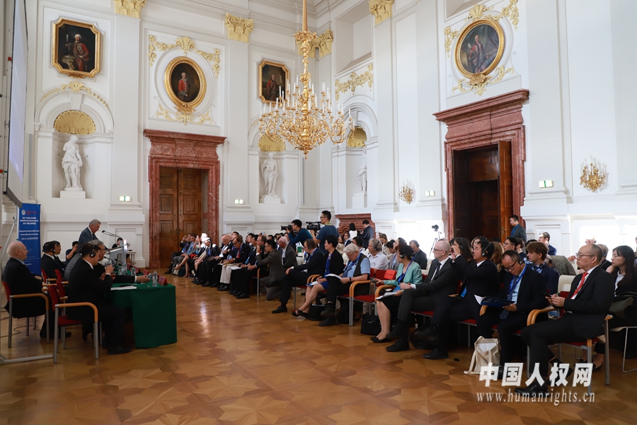 奧地利前總統(tǒng)、奧中友好協(xié)會(huì)主席海因茨·菲舍爾作開幕式致辭。菲舍爾先生在致辭中說,人權(quán)是全人類共同珍視的價(jià)值,雖然各國對(duì)人權(quán)的理解或有不同,促進(jìn)和保障人權(quán)的路徑也各有選擇,但實(shí)現(xiàn)人人充分得享人權(quán)的目標(biāo)是一致的。中歐人權(quán)領(lǐng)域的眾多專家學(xué)者參加本次研討會(huì),有助于增進(jìn)東西方對(duì)于人權(quán)價(jià)值的理解與共識(shí),彰顯了國際社會(huì)對(duì)推進(jìn)世界人權(quán)事業(yè)的共同努力。攝影 賈璞玉