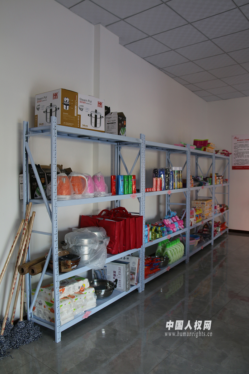 愛心超市中琳瑯滿目的貨品。當?shù)毓ぷ魅藛T介紹說,超市中換取最多的就是衛(wèi)生紙、洗衣液等生活必需品。(攝影/陳可)