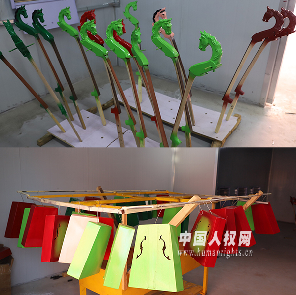 馬頭琴是一種蒙古民間拉弦樂器,有梯形的琴身和雕刻成馬頭形狀的琴柄。圖為(拼版照片)噴漆后正在晾干階段的馬頭琴,艷芳正在打磨的就是雕刻成馬頭形狀的琴柄。(攝影/賈璞玉)