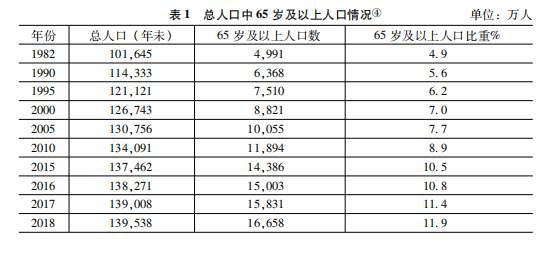 老齡化社會(huì)是老年人口占總?cè)丝谶_(dá)到或超過一定的比例的社會(huì)。按照聯(lián)合國的標(biāo)準(zhǔn),一個(gè)地區(qū)60歲以上老人達(dá)到總?cè)丝诘?0%,或者65歲以上老人占總?cè)丝诘?%,該地區(qū)即進(jìn)入老齡化社會(huì)。①中國大陸自2000年開始65歲及以上的人口比重超過7%,正式進(jìn)入老齡化社會(huì)。國家統(tǒng)計(jì)局“2010年第六次全國人口普查主要數(shù)據(jù)公報(bào)”顯示,大陸31個(gè)省、自治區(qū)、直轄市和現(xiàn)役軍人的人口中,60歲及以上人口為177,648,705人,占13.26%;與2000年第五次全國人口普查相比,60歲及以上人口的比重上升2.93個(gè)百分點(diǎn)。②以65歲及以上的老年人口為例,我國在2000年65歲以上的人口比重為7%,之后呈快速上升的趨勢(shì),至2016年比重升至10.8%。根據(jù)國家統(tǒng)計(jì)局公布的數(shù)據(jù),截至2018年年底,我國139,538萬人口中65歲以上的人口為16,658萬人③,占總?cè)丝跀?shù)的11.9%。具體見表1。