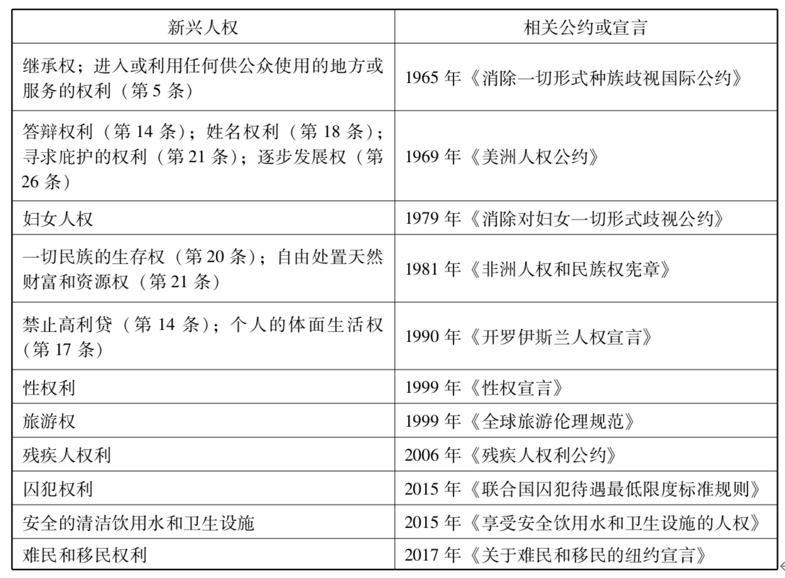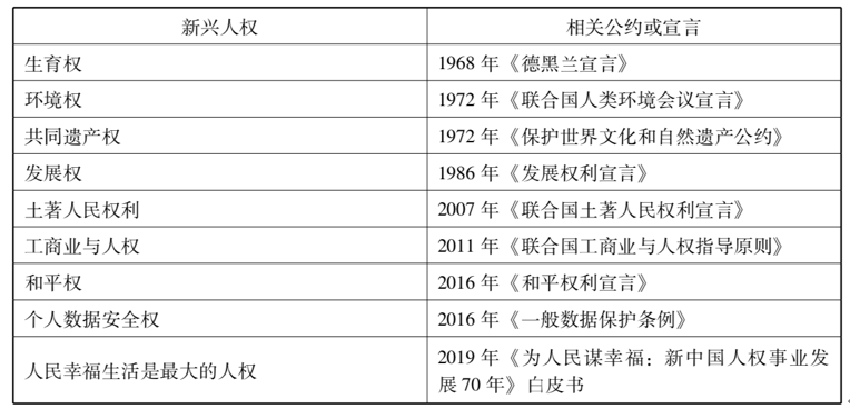 1968年《德黑蘭宣言》提出“生育權(quán)”的主張,認(rèn)為父母享有自由負(fù)責(zé)決定子女人數(shù)及其出生時(shí)距的基本人權(quán),賦予父母生育自由的權(quán)利。1972年《聯(lián)合國人類環(huán)境會議宣言》確立了“環(huán)境權(quán)”,這一新興人權(quán)主要源于《東京宣言》,其明確提出了環(huán)境權(quán)的要求,致力于人類免受環(huán)境危害的、繼續(xù)生存下去的權(quán)利。1972年《保護(hù)世界文化和自然遺產(chǎn)公約》確認(rèn)了“共同遺產(chǎn)權(quán)”是一項(xiàng)基本人權(quán),這一主張最早得益于聯(lián)合國教育、科學(xué)及文化組織對埃及阿布辛貝神殿等古跡的聯(lián)合保護(hù)行動(dòng)。1986年《發(fā)展權(quán)利宣言》宣布“發(fā)展權(quán)利”是一項(xiàng)不可剝奪的人權(quán),最早源自1972年塞內(nèi)加爾提出將發(fā)展權(quán)作為人權(quán)的主張,呼吁消除發(fā)展障礙。2017年第1期。2007年聯(lián)合國大會通過《土著人民權(quán)利宣言》,根源在于土著民族的特殊性造成了土著人民無法真正享有人權(quán)。2011年,約翰·魯格在參與起草工商業(yè)與人權(quán)的綜合性提案時(shí)認(rèn)為,跨國企業(yè)侵犯人權(quán)的現(xiàn)象不斷加深,需要強(qiáng)調(diào)跨國公司侵犯人權(quán)的責(zé)任追究,并提出“保護(hù)、尊重和補(bǔ)救”的指導(dǎo)原則??鐕髽I(yè)已是國際法律體系的“參與者”,有能力承擔(dān)國際人權(quán)法上的權(quán)利和義務(wù)。2012年歐盟頒布《一般數(shù)據(jù)保護(hù)條例》,為保護(hù)互聯(lián)網(wǎng)時(shí)代下的個(gè)人隱私和個(gè)人權(quán)利,提出“被遺忘權(quán)”“訪問權(quán)”“更正權(quán)”“刪除權(quán)”等新興個(gè)人權(quán)利。2016年《和平權(quán)利宣言》宣布“和平權(quán)”是一項(xiàng)人權(quán),其來源于1975年美蘇及西歐各國簽訂的《赫爾辛基宣言》,并認(rèn)為“尊重人權(quán)及自由是和平、正義及福利的基本要素”,“要通過法治和人權(quán),緩解國家內(nèi)部脆弱性和外部壓力,保障相對和平權(quán)”。2019年中國發(fā)表《為人民謀幸福:新中國人權(quán)事業(yè)發(fā)展70年》白皮書,提出“人民幸福生活是最大的人權(quán)”,這一主張基于當(dāng)前世界還有幾十億人民處于貧困之中,生活缺乏尊嚴(yán),希冀國際社會共同努力消除貧困以實(shí)現(xiàn)更多人的美好生活。
