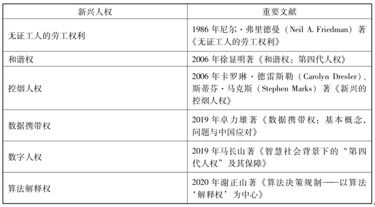 1986年尼爾·弗里德曼(Neil A.Friedman)提出無證工人的勞工權(quán)利,認(rèn)為在美國有200萬300萬的無證外國人不能享受更好的經(jīng)濟(jì)發(fā)展,其工資與勞動(dòng)不成比例,國家也拒絕向其提供社會服務(wù)和法律保護(hù),這樣大規(guī)模的不平等現(xiàn)狀理應(yīng)得到遏制,無證工人應(yīng)當(dāng)享有與勞動(dòng)相關(guān)的人權(quán)保護(hù)。2006年,徐顯明著文提出“和諧權(quán)”的主張,依托中國“和而不同”的思想。2006年卡羅琳·德雷斯勒(Carolyn Dresler)、斯蒂芬·馬克斯(Stephen Marks)根據(jù)世界衛(wèi)生組織通過的《煙草控制框架公約》認(rèn)為,公共衛(wèi)生健康關(guān)涉人權(quán)問題,不應(yīng)忽視由煙草導(dǎo)致的流行病對人類生命權(quán)和健康權(quán)的影響,而控?zé)煓?quán)作為一項(xiàng)新興人權(quán),其可以有效降低死亡率和并發(fā)率。2019年,卓力雄著文認(rèn)為,數(shù)據(jù)攜帶權(quán)是歐盟確立的一種新型個(gè)人權(quán)利,這一個(gè)人權(quán)利糅雜了人格權(quán)和財(cái)產(chǎn)權(quán)的相關(guān)內(nèi)容。2019年,馬長山著文確認(rèn)了“數(shù)字人權(quán)”的概念,認(rèn)為數(shù)據(jù)和信息不僅是人們數(shù)字化生活的重要資源,也是新時(shí)代人權(quán)發(fā)展的新型載體和價(jià)值表達(dá)。2020年,謝正山著文認(rèn)為,自動(dòng)化決策如果缺乏任何有意義的參與,都將導(dǎo)致人們的無力感與脆弱感,從而產(chǎn)生“非人化”狀態(tài),而賦予人們算法“解釋權(quán)”這項(xiàng)權(quán)利不僅不會影響社會及倫理價(jià)值,反而是對人的自主、尊嚴(yán)及人格的尊重。