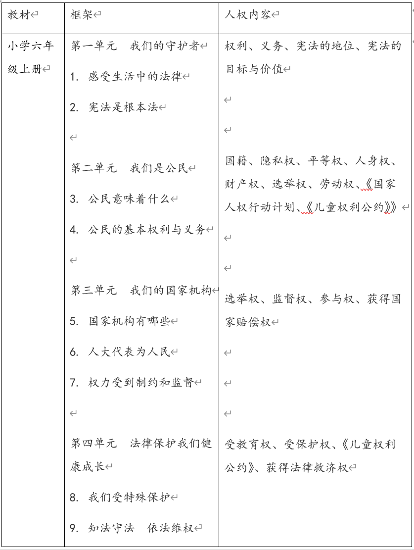 《道德與法治》作為全國統(tǒng)編通用的義務(wù)教育教材,承載著在中小學(xué)開展高質(zhì)量人權(quán)教育的重要職責(zé)?!兜赖屡c法治》課程實(shí)施中小學(xué)人權(quán)教育,主要從如下兩個(gè)方面展開: