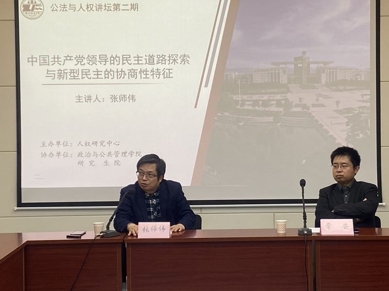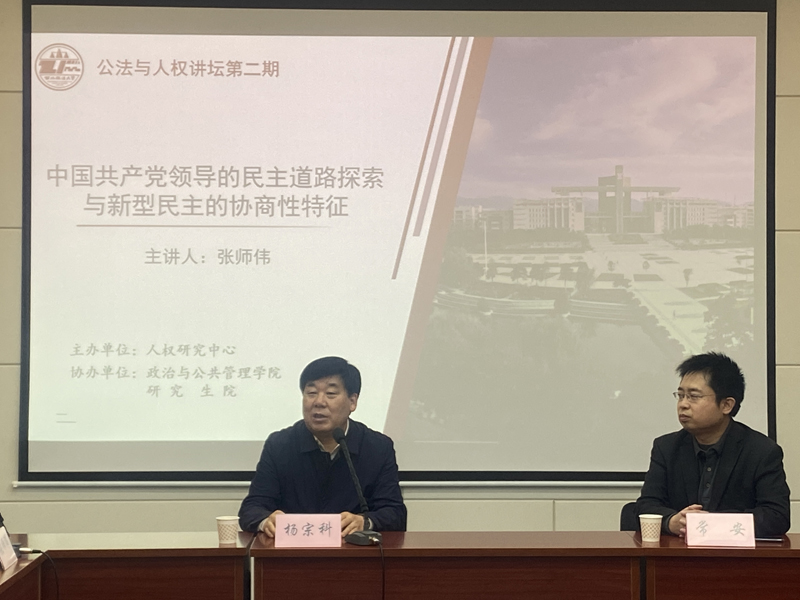 4月15日晚,由西北政法大學人權研究中心主辦,政治與公共管理學院、研究生院協(xié)辦的“公法與人權”講壇第二期、“中國共產黨與人權保障”專題之一在雁塔校區(qū)舉辦,政治與公共管理學院張師偉教授主講《中國共產黨領導的民主道路探索與新型民主的協(xié)商性特征》。校長楊宗科出席并講話,行政法學院副院長、人權研究中心研究員常安教授主持,行政法學院教授、人權研究中心研究員錢錦宇,政治與公共管理學院副院長、人權研究中心研究員楊立峰副教授作為與談嘉賓。中心教師和該校部分博士研究生、碩士研究生、本科生60余人參與了本次會議。