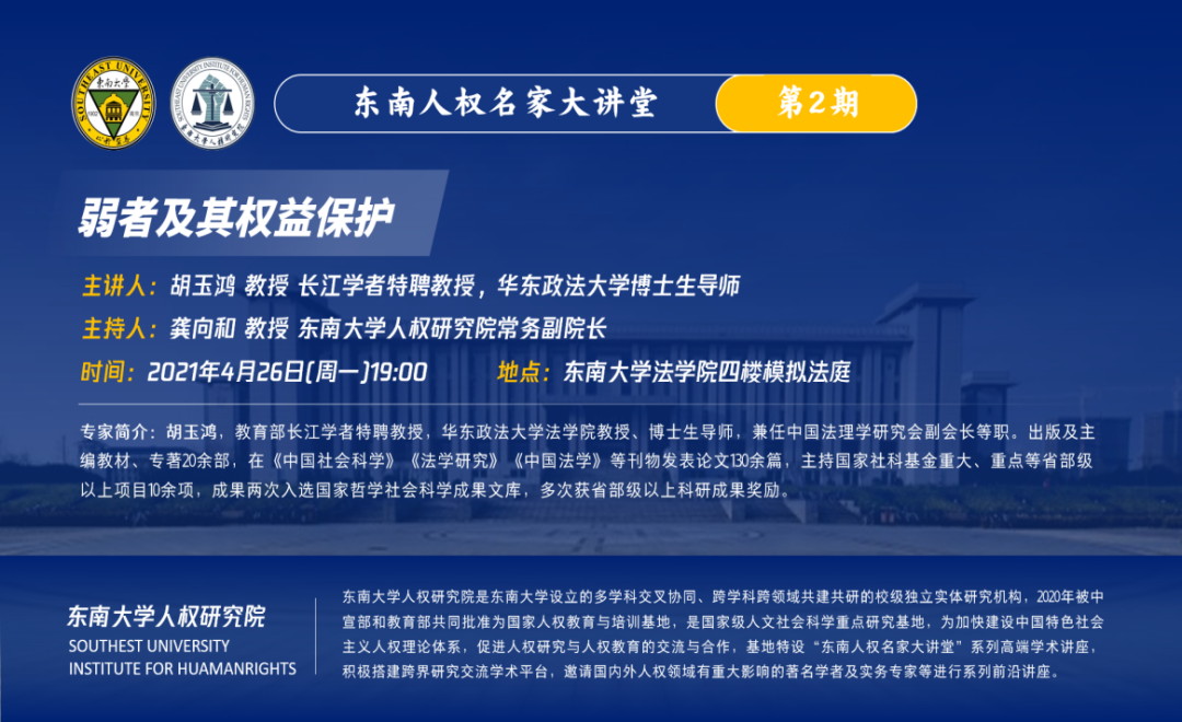 2021年4月26日晚上,教育部長(zhǎng)江學(xué)者特聘教授、華東政法大學(xué)博士生導(dǎo)師胡玉鴻應(yīng)邀來(lái)到東南大學(xué)人權(quán)研究院,以“弱者及其權(quán)益保護(hù)”為題,在法學(xué)院四樓模擬法庭舉行講座。本次講座由東南大學(xué)人權(quán)研究院常務(wù)副院長(zhǎng)龔向和教授主持,法學(xué)院師生共同參加了這次講座。