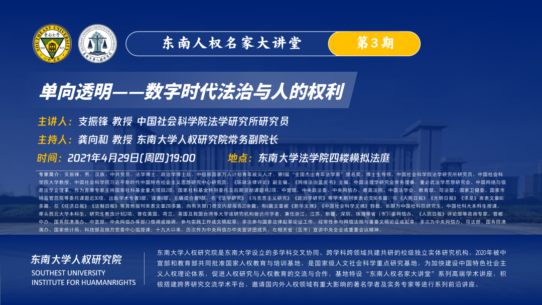2021年4月29日晚上,中國社會科學(xué)院法學(xué)研究所研究員、中國社會科學(xué)院大學(xué)教授支振鋒應(yīng)邀來到東南大學(xué)人權(quán)研究院,以“單向透明——數(shù)字時代法治與人的權(quán)利”為題,在法學(xué)院四樓模擬法庭舉行講座。本次講座由東南大學(xué)人權(quán)研究院常務(wù)副院長龔向和教授主持,法學(xué)院師生共同參加了這次講座。
