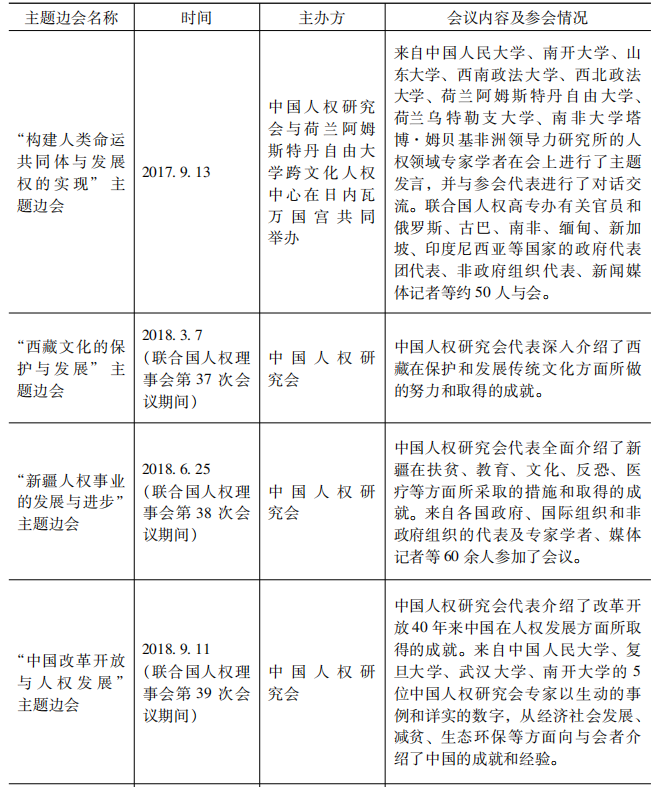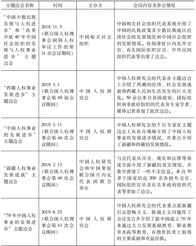 表8 2017-2019年中國人權社會組織在聯(lián)合國萬國宮舉辦人權主題邊會情況