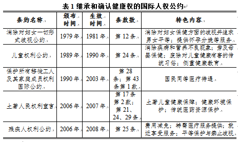 以《經(jīng)濟、社會和文化權(quán)利國際公約》為基礎,健康權(quán)得到了一系列國際人權(quán)公約,尤其是針對特定群體的人權(quán)保護公約的繼承和確認。健康權(quán)成為人權(quán)公約中不可缺少的內(nèi)容。不過在內(nèi)容上,它們基本都是公約第12條的重申或者結(jié)合主體特色的適當變通,即主要規(guī)定了國家應當采取的措施和健康權(quán)所應當實現(xiàn)的內(nèi)容。這些國際性的人權(quán)公約包括以下五個(見表1)。