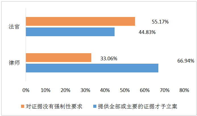 立案登記制雖早在2015年就已全面實(shí)行,但從此次調(diào)研結(jié)果來(lái)看,立案法官超越法律權(quán)限,對(duì)立案材料中的主體資格、法律關(guān)系、訴訟請(qǐng)求、證據(jù)等進(jìn)行實(shí)質(zhì)審查的情況仍然較為常見。調(diào)研數(shù)據(jù)顯示,僅有29.31%的法官明確表示不會(huì)對(duì)立案材料進(jìn)行實(shí)質(zhì)審查,44.83%的法官在立案時(shí)會(huì)要求律師或當(dāng)事人必須提供全部或主要的證據(jù)材料。79.84%的律師表示其在近一年內(nèi)的立案中遭遇過(guò)實(shí)質(zhì)審查,被要求提供證據(jù)才能立案的占比66.94%。由此可見,當(dāng)前民事立案登記制的實(shí)踐效果與保護(hù)當(dāng)事人訴權(quán)為主的預(yù)期功能存在一定偏差,部分立案法官?zèng)]有充分領(lǐng)會(huì)立案登記制的實(shí)質(zhì)內(nèi)涵和制度要求,對(duì)立案審查的把控過(guò)于嚴(yán)苛,實(shí)質(zhì)上限制了當(dāng)事人對(duì)民事訴權(quán)的行使。