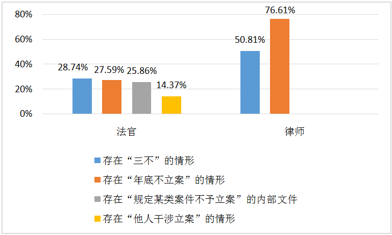 根據(jù)現(xiàn)行《中華人民共和國(guó)民事訴訟法》(以下簡(jiǎn)稱“民訴法”)的規(guī)定,對(duì)于符合起訴條件的立案申請(qǐng),法院必須受理。但在司法實(shí)踐中,有案不立、人為控制立案、年底不立案等現(xiàn)象仍然存在。法院通過(guò)選擇性立案的方式,將不宜、不能、不愿意處理的糾紛通過(guò)立案環(huán)節(jié)阻擋在訴訟程序之外。調(diào)研數(shù)據(jù)顯示,50.81%的律師在最近一年內(nèi)遇到過(guò)法院“不收材料、不予答復(fù)、不出具法律文書”的情況,且有76.61%的律師反映法院存在年底不立案的現(xiàn)象。對(duì)此,71.26%的法官表示其所在法院并不存在“不收材料、不予答復(fù)、不出具法律文書”的情況,且僅有27.59%的法官表示其所在法院會(huì)年底不立案。此外,25.86%的法官表示其所在法院存在規(guī)定某類案件不予立案的內(nèi)部文件,14.37%的法官反映存在法院內(nèi)部人員、其他機(jī)關(guān)、團(tuán)體或個(gè)人干涉立案的情況。在法院是否會(huì)選擇性立案的問題上,律師數(shù)據(jù)和法官數(shù)據(jù)存在較大差異,其中部分原因在于問卷提問方式的不同——律師以提問個(gè)人為主,法官則要求以法院為基礎(chǔ)作答。但不可否認(rèn)的是,符合起訴條件的民事糾紛被排除在立案程序之外的情形確有發(fā)生。并且,這種人為影響立案的行為實(shí)際上是對(duì)當(dāng)事人訴權(quán)的變相否定,是造成“立案難”的重要原因。