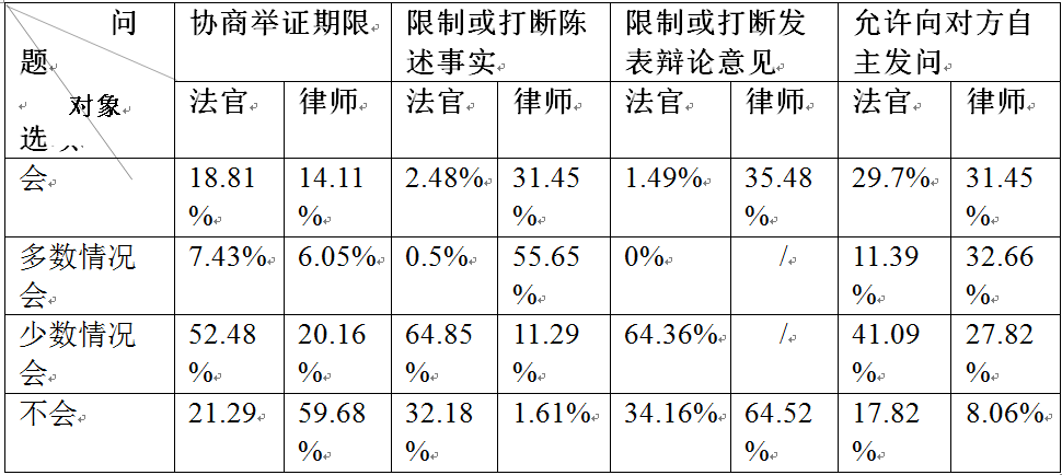 現(xiàn)代民事訴訟為訴權(quán)與審判權(quán)的關(guān)系,配置的是一種共同協(xié)作、相互制衡的雙向式模式。但就調(diào)研結(jié)果來(lái)看,我國(guó)訴權(quán)與審判權(quán)的實(shí)踐關(guān)系尚未達(dá)到動(dòng)態(tài)平衡的狀態(tài),法官仍然傾向于主導(dǎo)審判進(jìn)程,而不太重視發(fā)揮民事訴權(quán)的作用,因此當(dāng)事人權(quán)利行使的自由受到一定限制。如表1所示,在舉證權(quán)利方面,約有78.72%的法官會(huì)與當(dāng)事人協(xié)商舉證期限,但59.68%的律師明確表示在最近一年代理的案件中,都沒有遇到過(guò)法官與其協(xié)商確定舉證期限的情況。在辯論權(quán)行使方面,只有41.09%的法官表示大多數(shù)情況下會(huì)在庭審中允許當(dāng)事人自主向?qū)Ψ桨l(fā)問,占比近七成的法官表示存在打斷或限制當(dāng)事人陳述事實(shí)、理由或發(fā)表辯論意見的情況,并且有98.39%的律師反映曾遇到過(guò)法官限制或打斷當(dāng)事人陳述事實(shí)。在限制的理由中,2.57%是不讓說(shuō),47.91%是為了提高審判效率而限定發(fā)言時(shí)間,另外49.52%則表示只能按照法官限定的范圍發(fā)言。由此可見,當(dāng)事人訴權(quán)在民事審判程序中的地位還有待進(jìn)一步提升。
