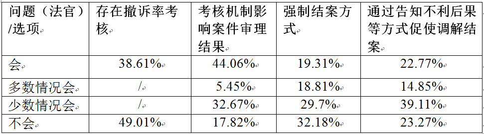 正當(dāng)程序?qū)γ袷略V權(quán)行使的保障具有重要意義。但在當(dāng)前的民事審判實(shí)踐中,存在考核機(jī)制不合理、審判流程不規(guī)范等問題,導(dǎo)致立法預(yù)設(shè)的審判程序出現(xiàn)了一定程度的偏離。例如,基于對(duì)維穩(wěn)的片面追求,部分法院對(duì)法官業(yè)績(jī)考核指標(biāo)中的調(diào)解率、撤訴率、上訴率、改判率等存在不合理的要求,迫使法官通過(guò)干預(yù)當(dāng)事人程序選擇的方式提高調(diào)解率,以滿足考核要求。此時(shí),審判利益成為法官審理案件的主要考慮因素,因而忽視了對(duì)當(dāng)事人訴權(quán)的充分保障。調(diào)研數(shù)據(jù)顯示,有38.61%的法官表示其所在法院存在撤訴率考核;82.18%的法官認(rèn)為調(diào)解率、結(jié)案率、錯(cuò)案率等考核指標(biāo)會(huì)對(duì)案件審理結(jié)果產(chǎn)生影響;67.82%的法官曾要求當(dāng)事人以調(diào)解或和解方式結(jié)案;76.73%的法官表示會(huì)通過(guò)告知當(dāng)事人不利后果等方式促使其調(diào)解結(jié)案。