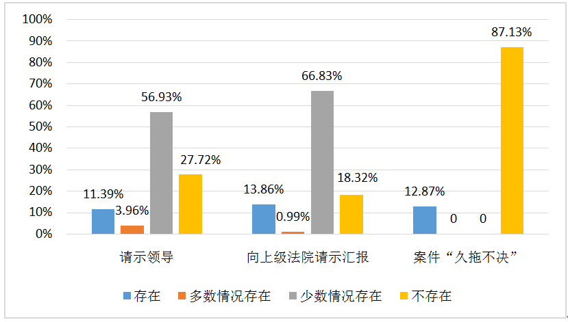 另外,法官辦案不遵守程序規(guī)則的情況依然存在,一定程度上對(duì)案件的公正審理產(chǎn)生負(fù)面影響。如圖7所示,72.28%的法官表示其所在法院存在判決前需要向庭長(zhǎng)或本院領(lǐng)導(dǎo)請(qǐng)示的情況,且需要向上級(jí)法院匯報(bào)的比例超過(guò)八成。然而在請(qǐng)示匯報(bào)中,上級(jí)法院通過(guò)訴訟外的程序介入案件審理,其實(shí)是對(duì)當(dāng)事人審級(jí)利益的變相否定,導(dǎo)致上訴權(quán)形同虛設(shè),與現(xiàn)代法治社會(huì)的正當(dāng)程序理念相背離。在結(jié)案期限方面,12.87%的法官表示其主辦的案件存在久拖不決的情況,但超過(guò)50%的律師表示曾遭遇過(guò)法院超出法定審限結(jié)案的情況。低效率的案件審理會(huì)給當(dāng)事人帶來(lái)無(wú)端的訴累,成為當(dāng)事人訴權(quán)實(shí)現(xiàn)的阻礙,這對(duì)審判權(quán)的提質(zhì)增效提出了要求。