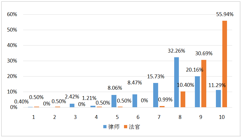 法官中立是司法公正的根基所在,也是平等保障當(dāng)事人訴權(quán)的重要前提。調(diào)研數(shù)據(jù)顯示,99.1%的法官認(rèn)為其可以客觀中立地審理案件。在平等對(duì)待雙方當(dāng)事人的問題上,法官個(gè)人評(píng)價(jià)的平均得分為9.32分(1-10分的區(qū)間)。然而,對(duì)法官中立的表現(xiàn),律師則給出了7.66分的評(píng)價(jià)(1-10分的區(qū)間),且有超過(guò)六成比例的律師認(rèn)為在其最近一年代理的案件中,法官有偏袒一方當(dāng)事人的言行。就調(diào)研情況而言,由于所處立場(chǎng)不同,法官與律師對(duì)是否平等對(duì)待當(dāng)事人的態(tài)度有所差異。但不可否認(rèn)的是,民事審判實(shí)踐中法官對(duì)雙方當(dāng)事人的平等保障與人民群眾的期待之間仍然存在一定差距。對(duì)此,需要分析造成這種差距的關(guān)鍵因素,并以此為基礎(chǔ)探求切實(shí)提升訴權(quán)保障水平的合理路徑。