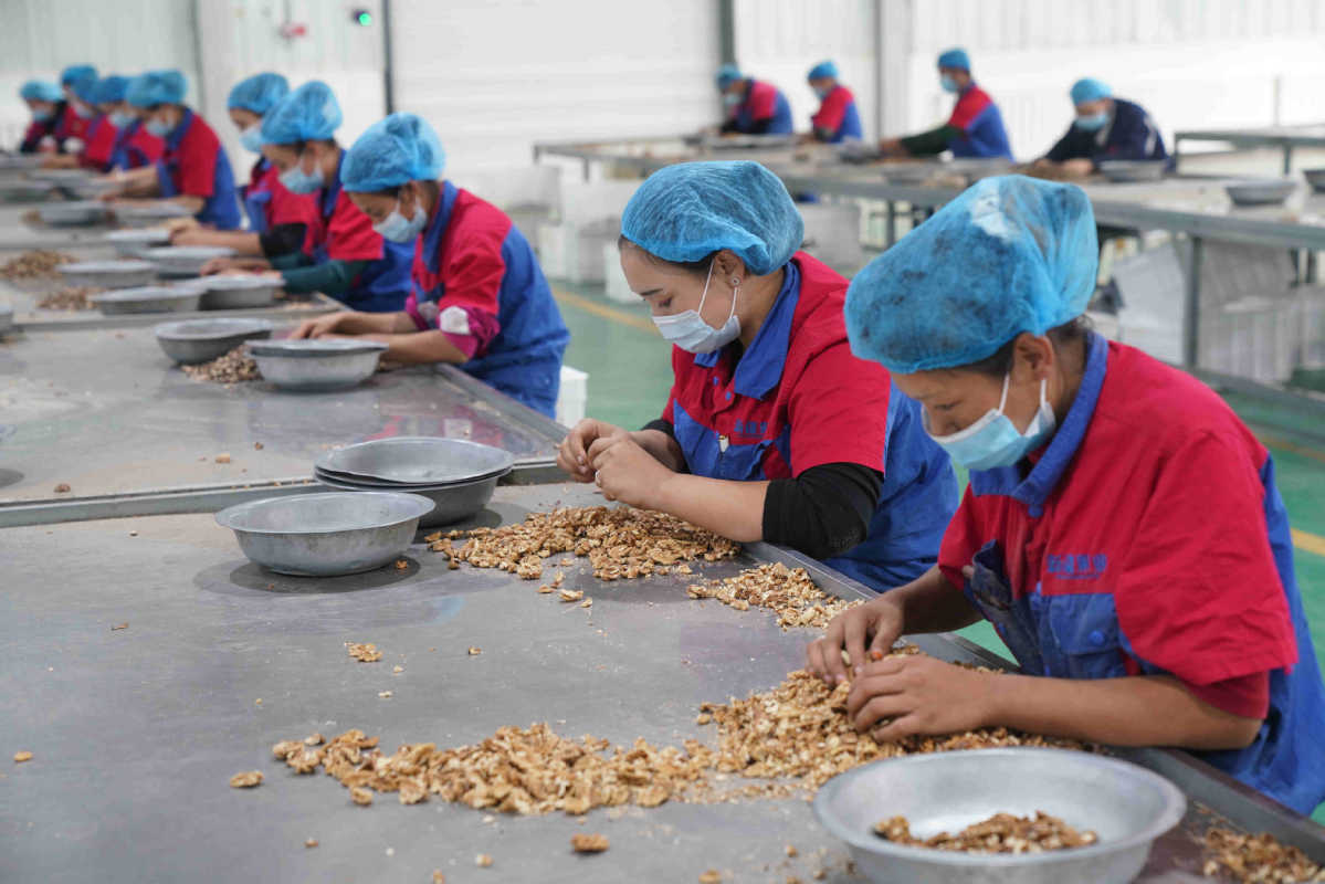 Workers sort walnuts at the sorting workshop in Xinjiang Guoye Company in Hotan county, Hotan prefecture, in Northwest China's Xinjiang Uygur autonomous region, on Sept 27, 2021. [Photo by Zhang Wande/For chinadaily.com.cn]
