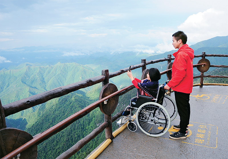為不斷滿足廣大殘疾人對(duì)美好生活的向往,各項(xiàng)建設(shè)事業(yè)都要把殘疾人事業(yè)納入其中,保障殘疾人平等權(quán)利,增進(jìn)殘疾人民生福祉。近年來(lái),湖南宜章縣莽山五指峰景區(qū)通過(guò)建設(shè)平緩步道、無(wú)障礙電梯、扶梯、提升機(jī)、爬樓機(jī)等設(shè)施,將不同海拔的游步道連接起來(lái),打造成無(wú)障礙游覽環(huán)線。圖為2021年5月14日,“輪椅游客”在觀景平臺(tái)輪椅專用席位觀賞莽山五指峰美景。 新華社記者 明星/攝