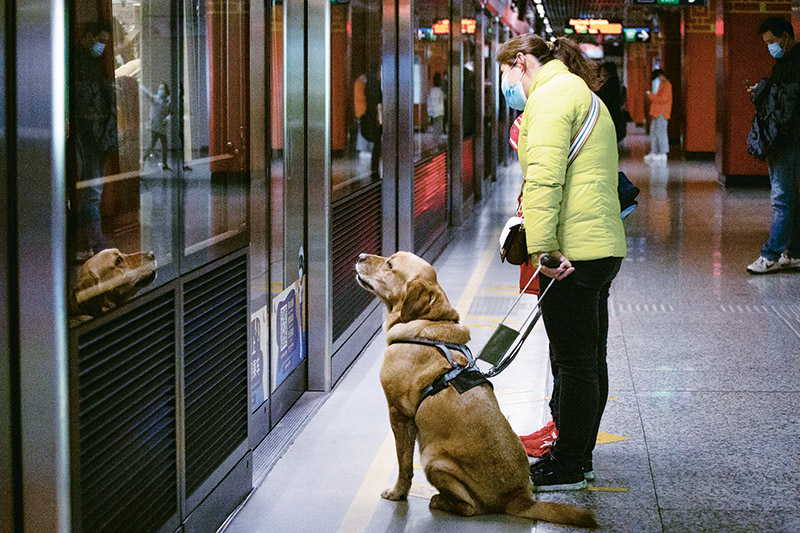 近年來(lái),我國(guó)城鄉(xiāng)無(wú)障礙環(huán)境不斷優(yōu)化,殘疾人日常出行、信息交流更加便利。圖為2021年3月13日,江蘇南京一名視力殘疾人在導(dǎo)盲犬的陪伴下乘坐地鐵出行。 新華社發(fā) 張夢(mèng)/攝