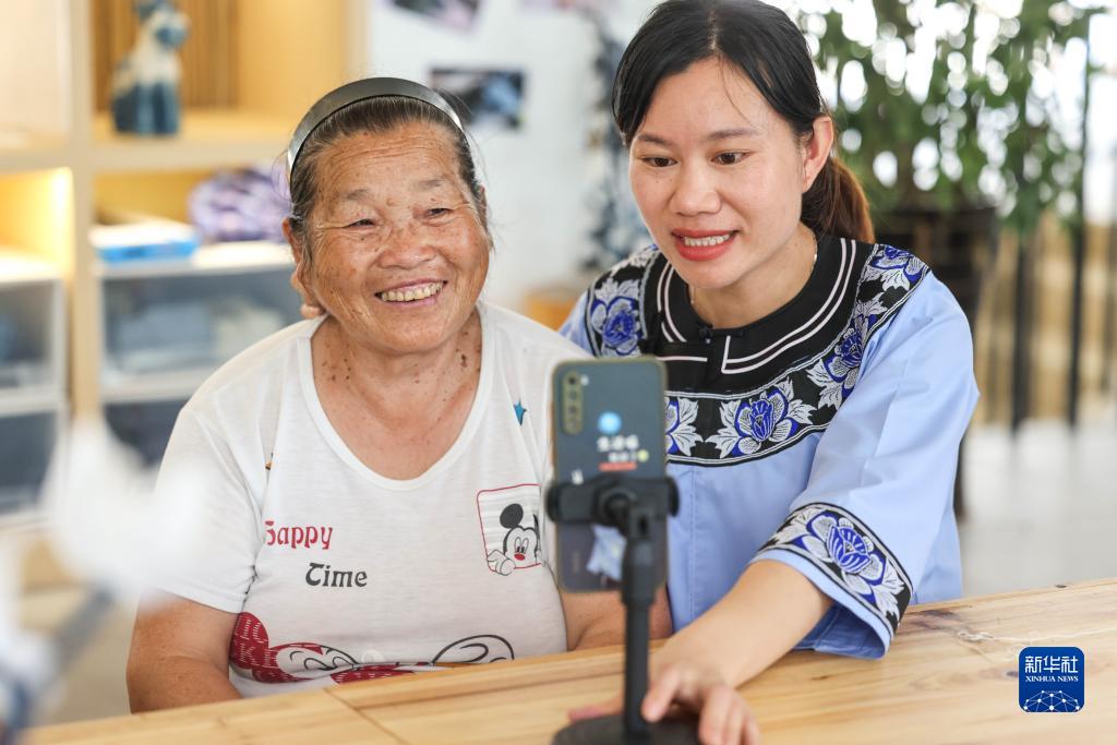6月23日,在貴州省黔東南苗族侗族自治州榕江縣特和社區(qū)“母親回家手工坊直播中心”內(nèi),主播王洪丹(右)與當(dāng)?shù)乩C娘進行直播。新華社記者 歐東衢 攝