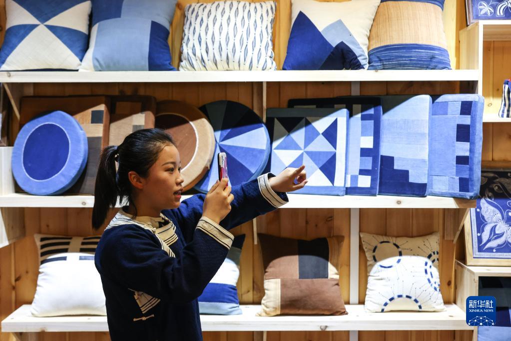 6月23日,在貴州省黔東南苗族侗族自治州榕江縣特和社區(qū)“母親回家手工坊直播中心”內(nèi),主播王洪丹通過直播推銷蠟染制品。新華社記者 歐東衢 攝
