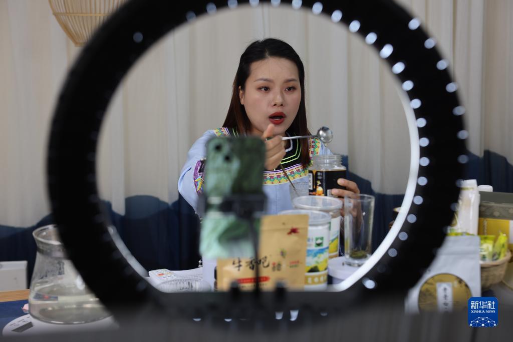 6月23日,在貴州省黔東南苗族侗族自治州榕江縣新媒體產(chǎn)業(yè)園一直播間,一名主播通過直播方式推銷當(dāng)?shù)靥禺a(chǎn)。新華社記者 歐東衢 攝