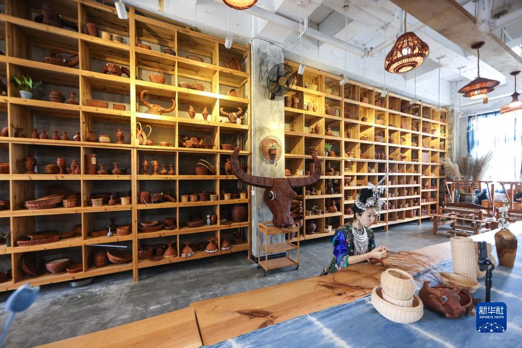 6月23日,在貴州省黔東南苗族侗族自治州榕江縣一蕨編工坊,主播張珍菲在直播蕨編編織過程。新華社記者 歐東衢 攝