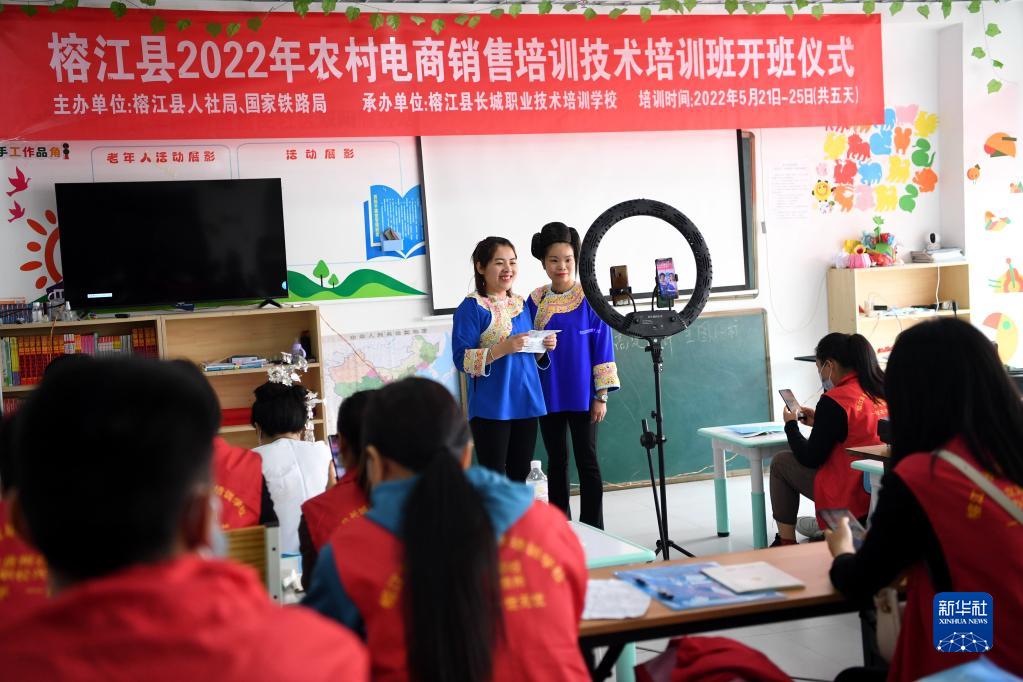 5月24日,貴州省榕江縣富民社區(qū)服務(wù)中心網(wǎng)絡(luò)直播營銷技能培訓(xùn)教室里,學(xué)員在進行直播實操訓(xùn)練。新華社發(fā)(王炳真 攝)
