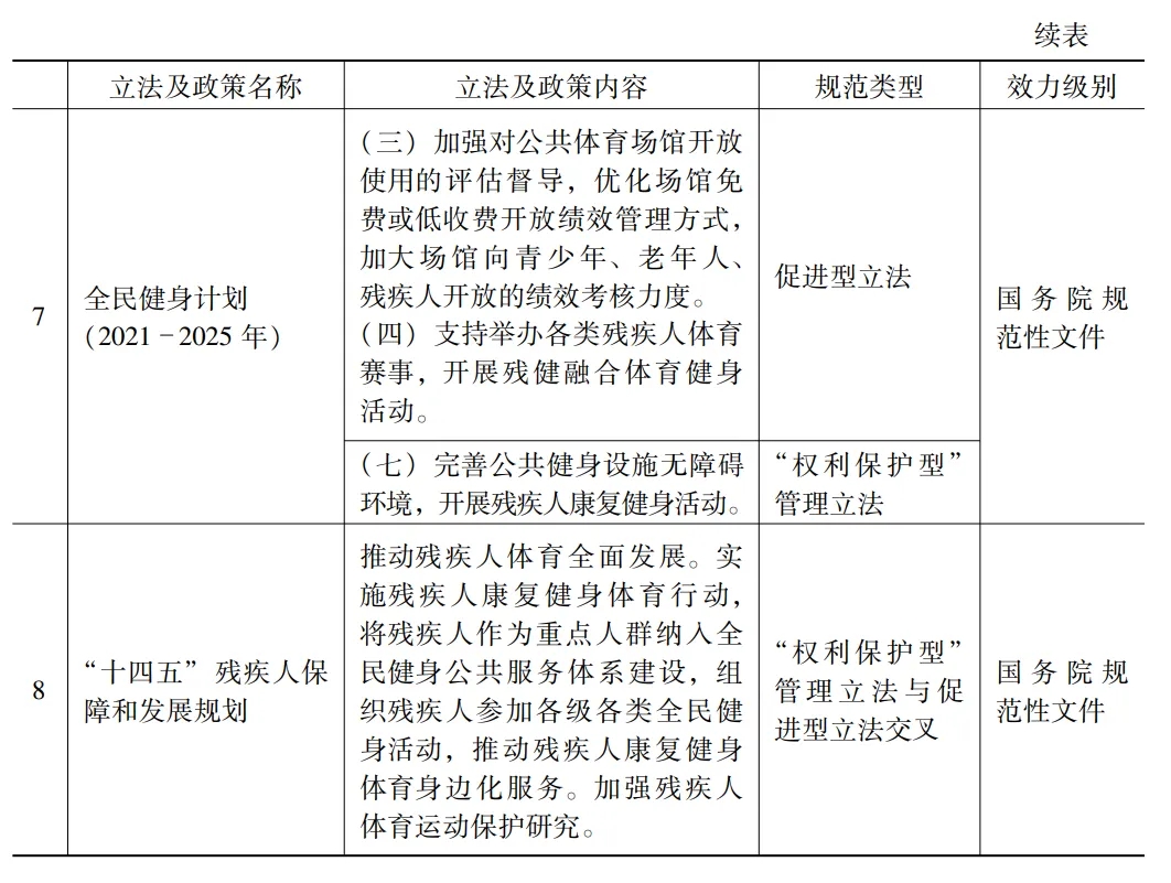 其次,殘疾人體育權(quán)利立法效力層級相對完善。不同層級法律規(guī)范的效力、內(nèi)容以及作為執(zhí)行依據(jù)的程度亦不相同,多層次立法既完善了法治統(tǒng)一又細(xì)化了權(quán)利保障內(nèi)容?!稓埣踩吮U戏ā贰扼w育法》作為法律從宏觀層面規(guī)定了國家是殘疾人體育權(quán)利保障的主體并鼓勵社會參與?!度窠∩項l例》《公共文化體育設(shè)施條例》《無障礙環(huán)境建設(shè)條例》以上位法為立法依據(jù),進一步規(guī)定國家通過充分考慮殘疾人行使體育權(quán)利的特殊需求來履行職責(zé)。作為法律效力層級較低和數(shù)量較多的部門規(guī)范性文件則,呈現(xiàn)出制定形式的系統(tǒng)化和長期性的特點,充分發(fā)揮了其制定內(nèi)容的靈活性和具體性的優(yōu)勢。如《全民健身計劃(2021-2025 年)》通過加大績效考核力度進而評估督導(dǎo)公共體育場館開放是否考慮了殘疾人的特殊需求。