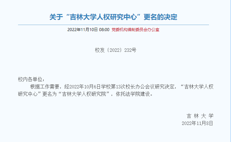 2022年11月8日,吉林大學(xué)黨委機(jī)構(gòu)編制委員會辦公室發(fā)布通知,經(jīng)2022年10月6日學(xué)校第13次校長辦公會議研究決定,“吉林大學(xué)人權(quán)研究中心”更名為“吉林大學(xué)人權(quán)研究院”,依托法學(xué)院建設(shè)。