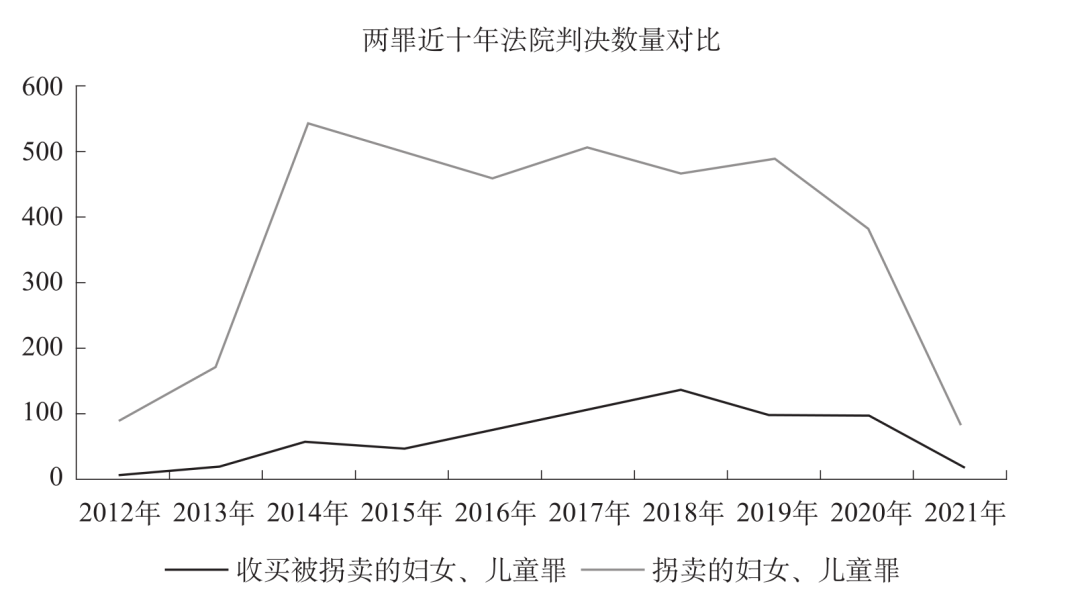 在司法適用層面來(lái)看,不少地方對(duì)收買被拐賣婦女兒童犯罪一直采取較為寬和的態(tài)度,是對(duì)此類犯罪處刑偏輕、懲治效果不彰的原因之一。有學(xué)者通過(guò)檢索“中國(guó)檢察網(wǎng)”和“中國(guó)裁判文書網(wǎng)”,對(duì)收買被拐賣的婦女罪案件的定罪處刑情況進(jìn)行了實(shí)證分析并指出,在136份不起訴決定書中廣泛援引《刑法》第13 條但書規(guī)定出罪;在568份有罪判決中頻繁適用緩刑與免予刑事處罰規(guī)定,導(dǎo)致該罪呈現(xiàn)高無(wú)罪率與高非實(shí)刑率的態(tài)勢(shì)。司法實(shí)踐中對(duì)收買被拐賣的婦女、兒童罪的定罪與量刑都較為寬松,從寬處罰是本罪刑事司法政策的主要傾向。筆者通過(guò)中國(guó)裁判文書網(wǎng)數(shù)據(jù)庫(kù)、威科先行法律信息庫(kù),檢索2012年至2021年的收買被拐賣的婦女兒童罪和拐賣婦女兒童罪的一審刑事判決書(為避免重復(fù)統(tǒng)計(jì),此次數(shù)據(jù)并不包含二審、再審案件),涉及拐賣婦女、兒童罪和收買被拐賣的婦女、兒童罪的一審刑事案件分別為3685件和633件,拐賣婦女兒童犯罪案件數(shù)量遠(yuǎn)高于收買被拐賣婦女兒童犯罪案件。十年來(lái),收買被拐賣婦女兒童犯罪案件為:2021年17件;2020年94件;2019年93件;2018年133件;2017年108件;2016年74件;2015年43件;2014年53件;2013年14件;2012年4件。如圖所示: