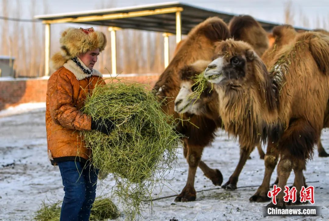 2023年1月,新疆阿勒泰地區(qū)福??h牧民那爾多斯·巴合提別克在自家的后院為養(yǎng)殖的駱駝投放飼草。劉新 攝