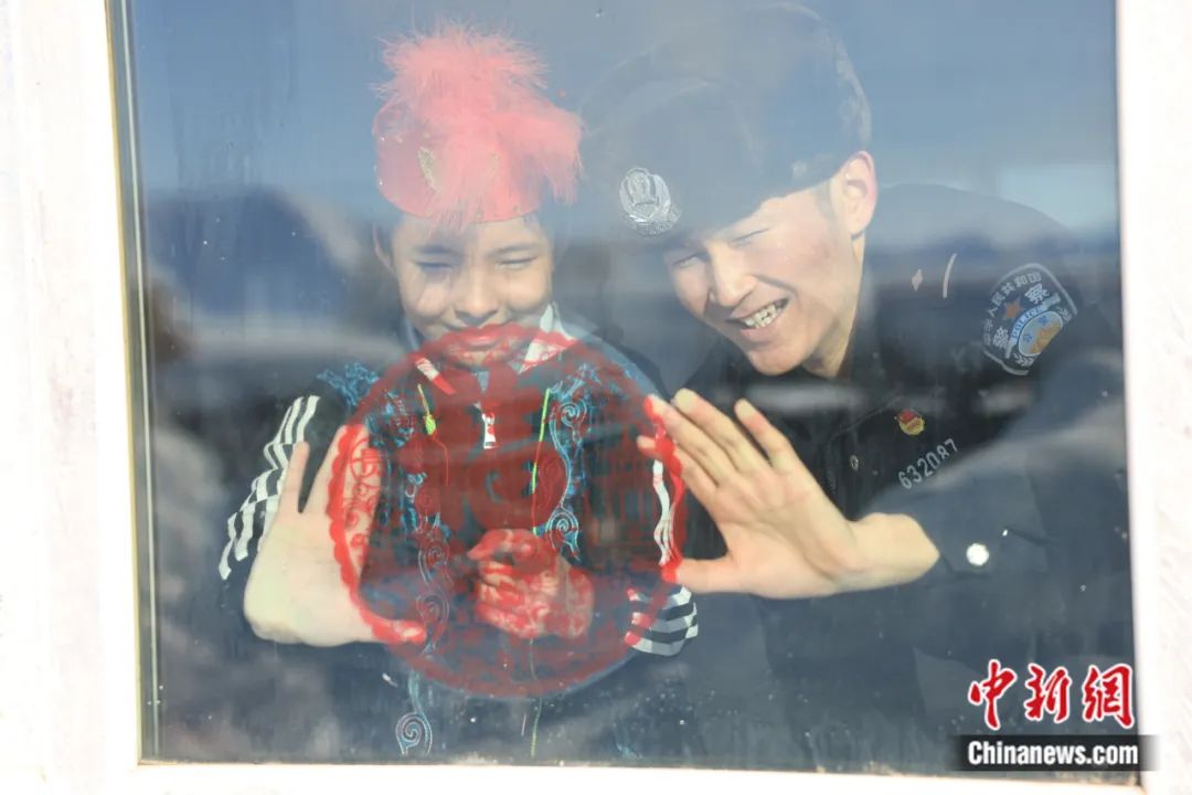 2023年大年初一,新疆維吾爾自治區(qū)阿勒泰地區(qū)富蘊縣,民警與市民貼窗花。王友波 攝
